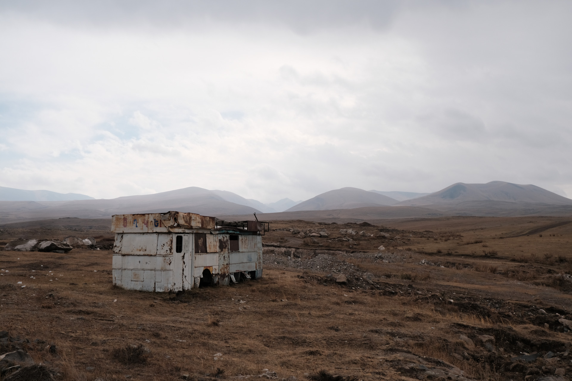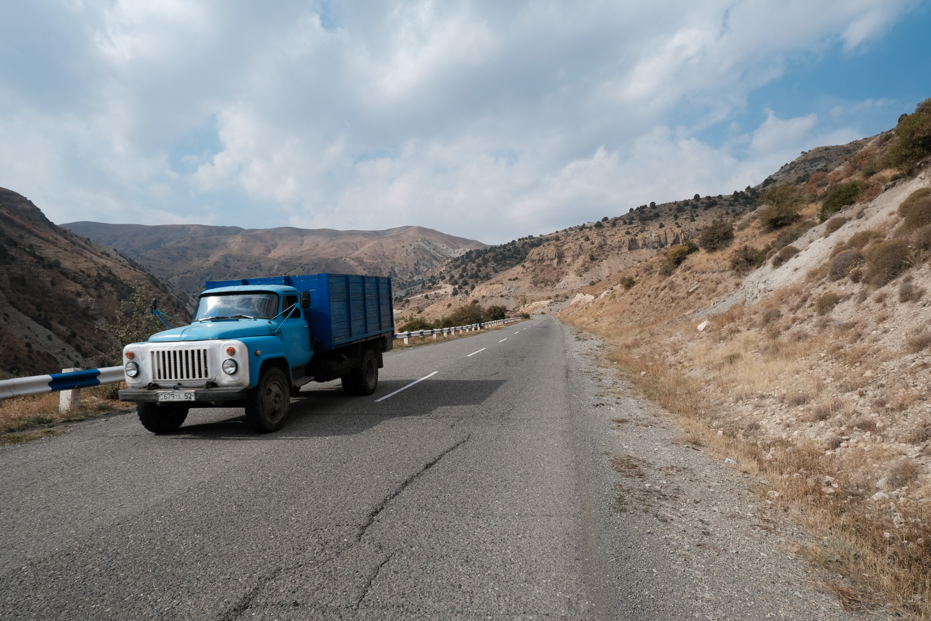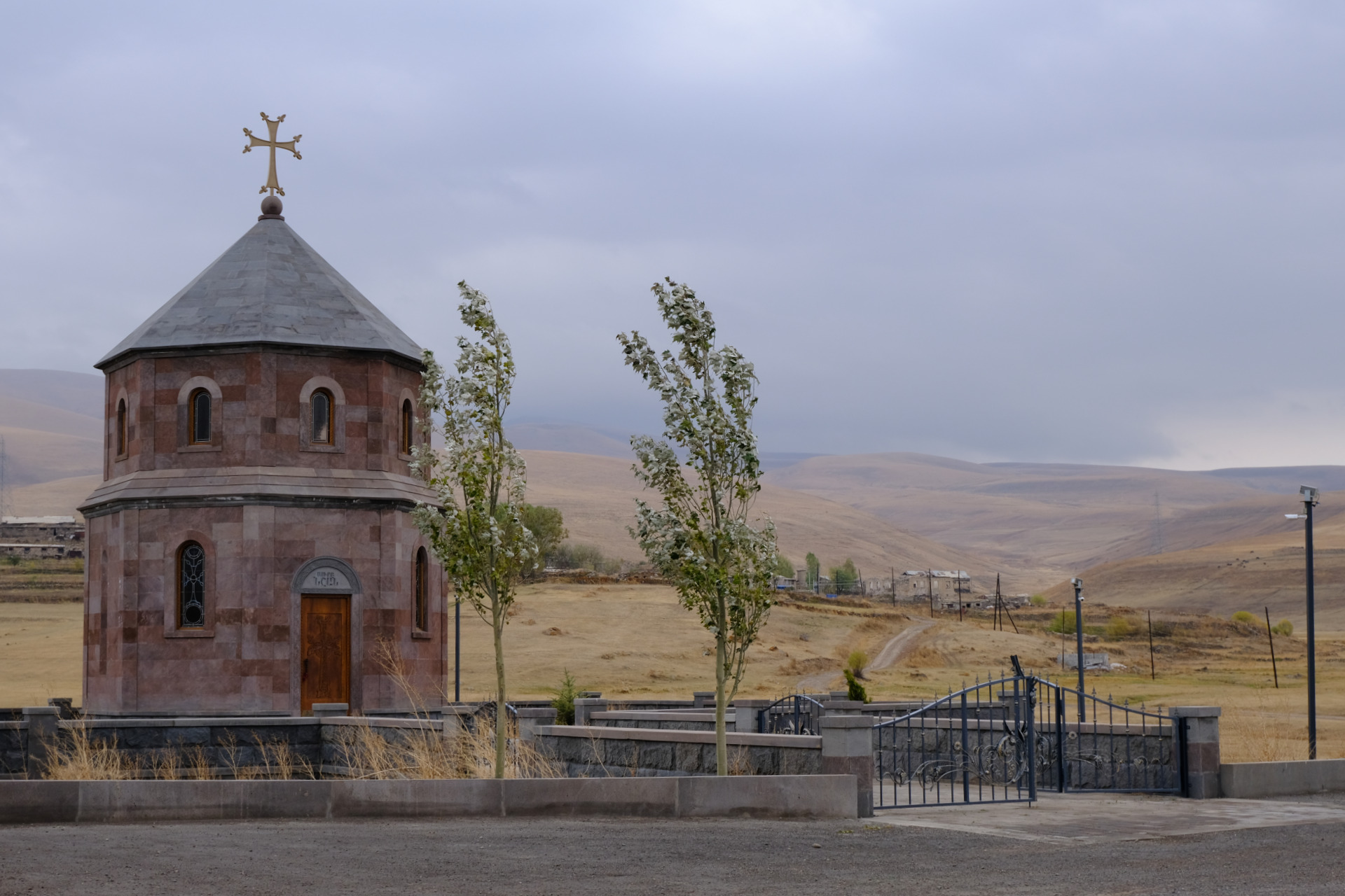 Nach einem kurzen Frühstück ging es weiter, hoch auf den Pass und über ein leicht abfallendes Plateau wieder nach unten. An einer Kirche mitten in der Pampa stand plötzlich eine eingemummte Frau am Straßenrand, die nicht besonders armenisch wirkte. Meine Neugier war geweckt, also hielt ich an und fragte nach. Alex kam aus Deutschland und war von Istanbul aus per Anhalter durch den Kaukasus unterwegs – und wieder zurück. Momentan hatte sie jedoch das Problem, hier abgesetzt worden zu sein. Ich schien aber Glück gebracht zu haben, denn nach ein wenig Smalltalk kam ein Wagen vorbei, der sie mitnahm.