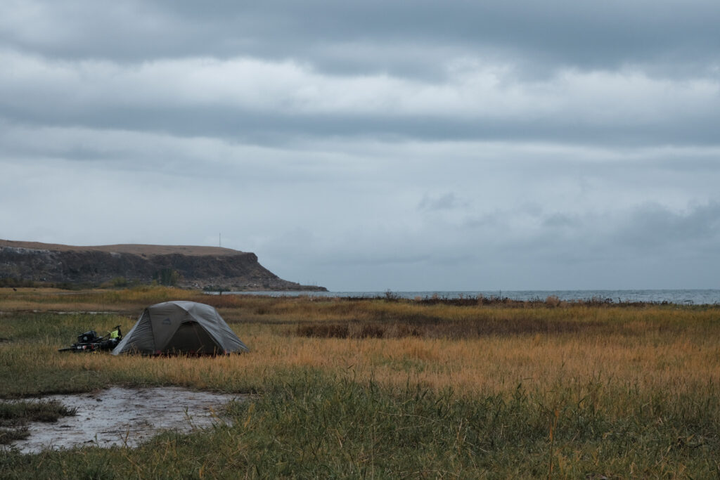 Am Straßenrand kaufte ich schließlich noch einen geräucherten Fisch sowie Brot und Sanddornsaft ein. Diese Beeren wachsen hier am See in rauen Mengen. Kurz darauf war jedoch Schluss mit dem Radeln: Das Thermometer fiel auf 2 °C, und zusammen mit dem Regen wollte ich nicht mehr weiterfahren. Ich bog zum Ufer des Sees ab.