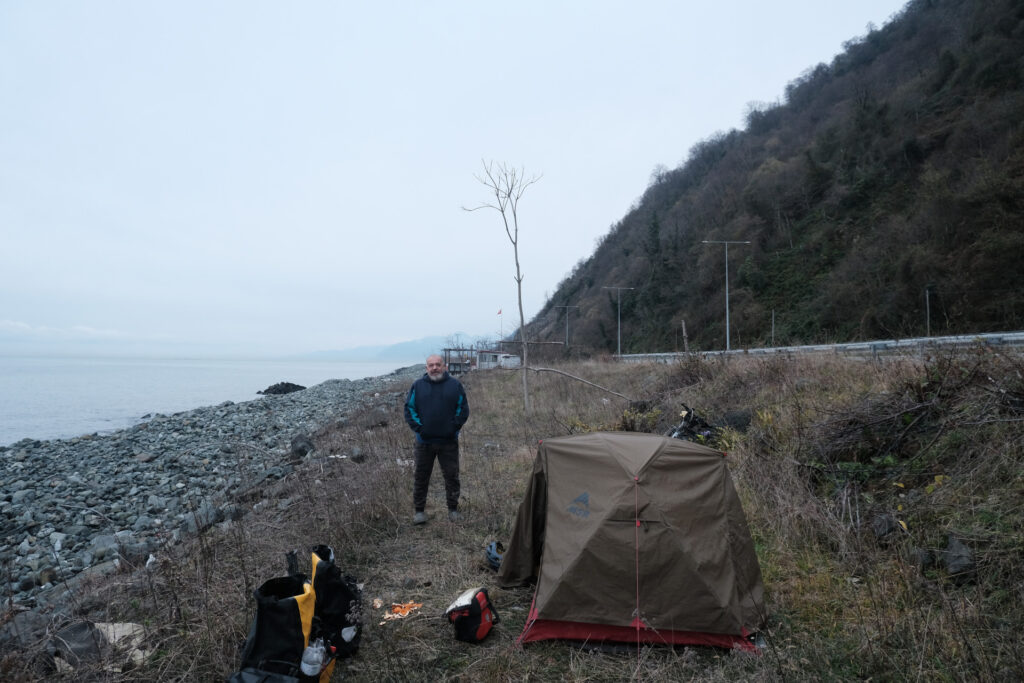 In der Türkei führte die Route dann durchgehend über die Autobahn, direkt zwischen Meer und Bergen entlang. Das klingt zwar nett, aber das Wetter war grau, nass, windig und beißend kalt und es war extrem schwer, einen Platz fürs Zelt zu finden. Letztendlich baute ich mein Nachtlager neben einer kleinen Hütte auf einem felsigen Stück Grün auf.