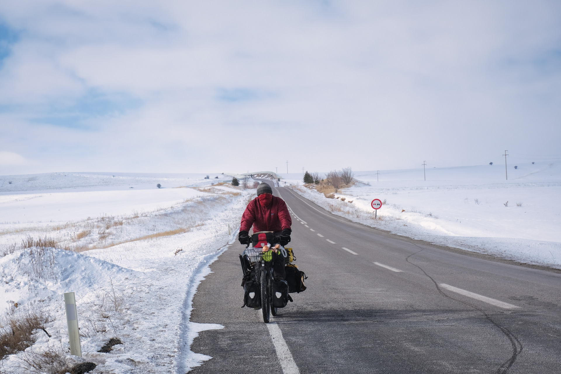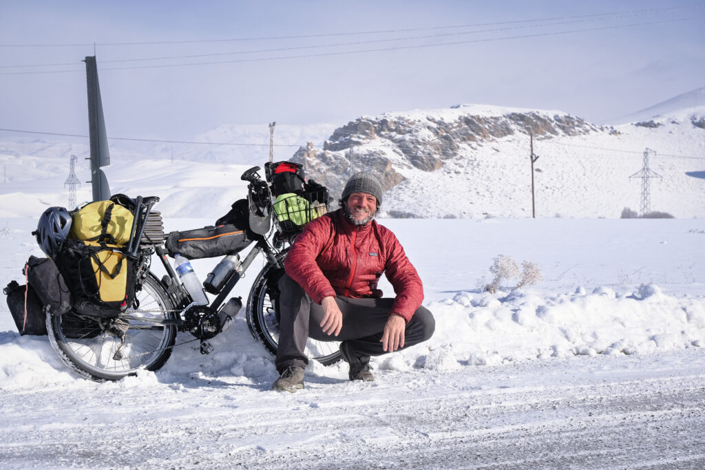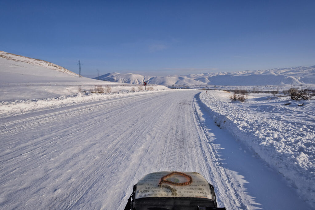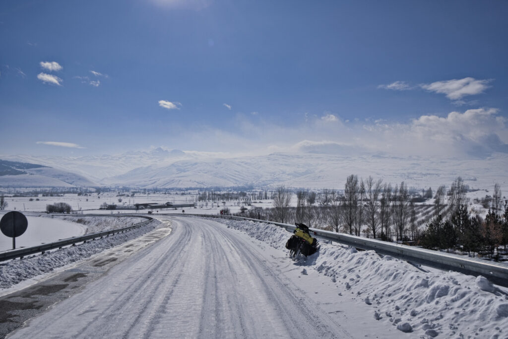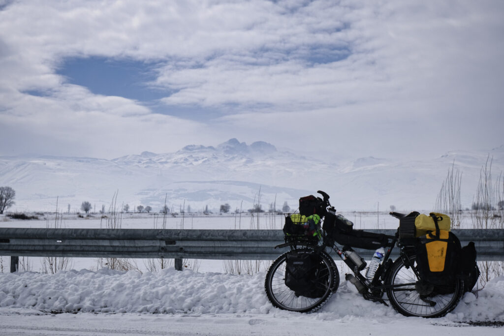Als ich auf 2.000 Höhenmetern ankam, wurde es langsam spät. Ich schob mein Rad gerade durch den Tiefschnee zu einem schneefreien Platz für mein Zelt abseits der Straße, als die Jandarma (Gendarmerie) anhielt und mir zuwinkte. Die Ansage war klipp und klar: Ich muss zurück. Campen sei zu gefährlich, da es zu kalt wird. Das hat mich in dem Moment natürlich ordentlich genervt. Auch mein Einwand, dass ich damit zurechtkomme, und das Zeigen von Bildern meiner letzten Campstellen nützte nichts – ich musste zurück. Es war einfach frustrierend, so bevormundet zu werden, aber ich hatte keine Wahl. Trotzdem muss man sagen: Die Jungs waren eigentlich total nett und wollten mich und mein Rad sogar fahren, aber ich verneinte. Wenn, dann radle ich selbst zurück.