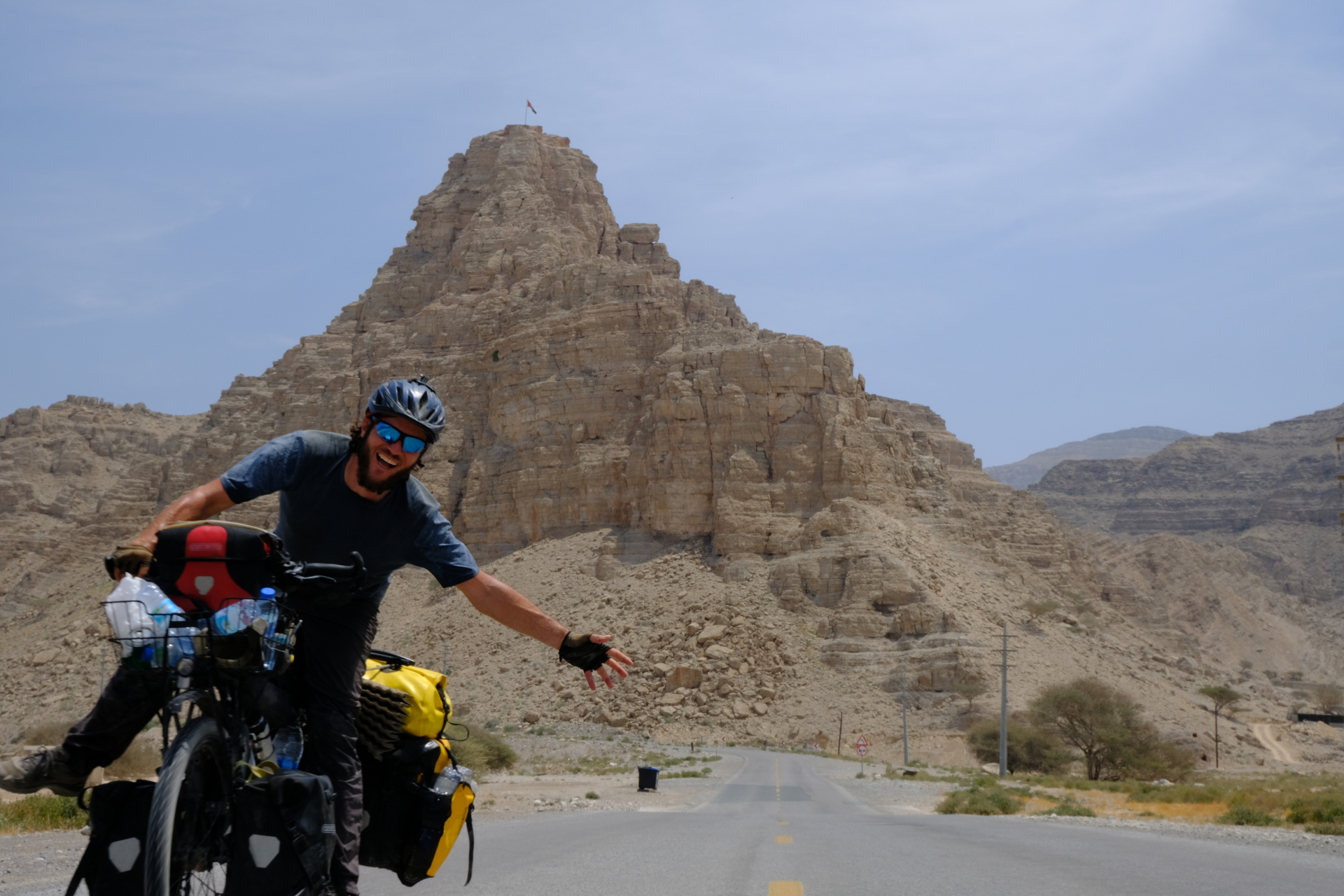 Ein pyramidenförmiger sandiger Berg ragt im Hintergrund auf. Ich fahre seitlich versetzt mit dem Rad auf die Kamera zu, lehne mich Richtung Straßenmitte vom Fahrrad und strecke den Daumen nach oben.