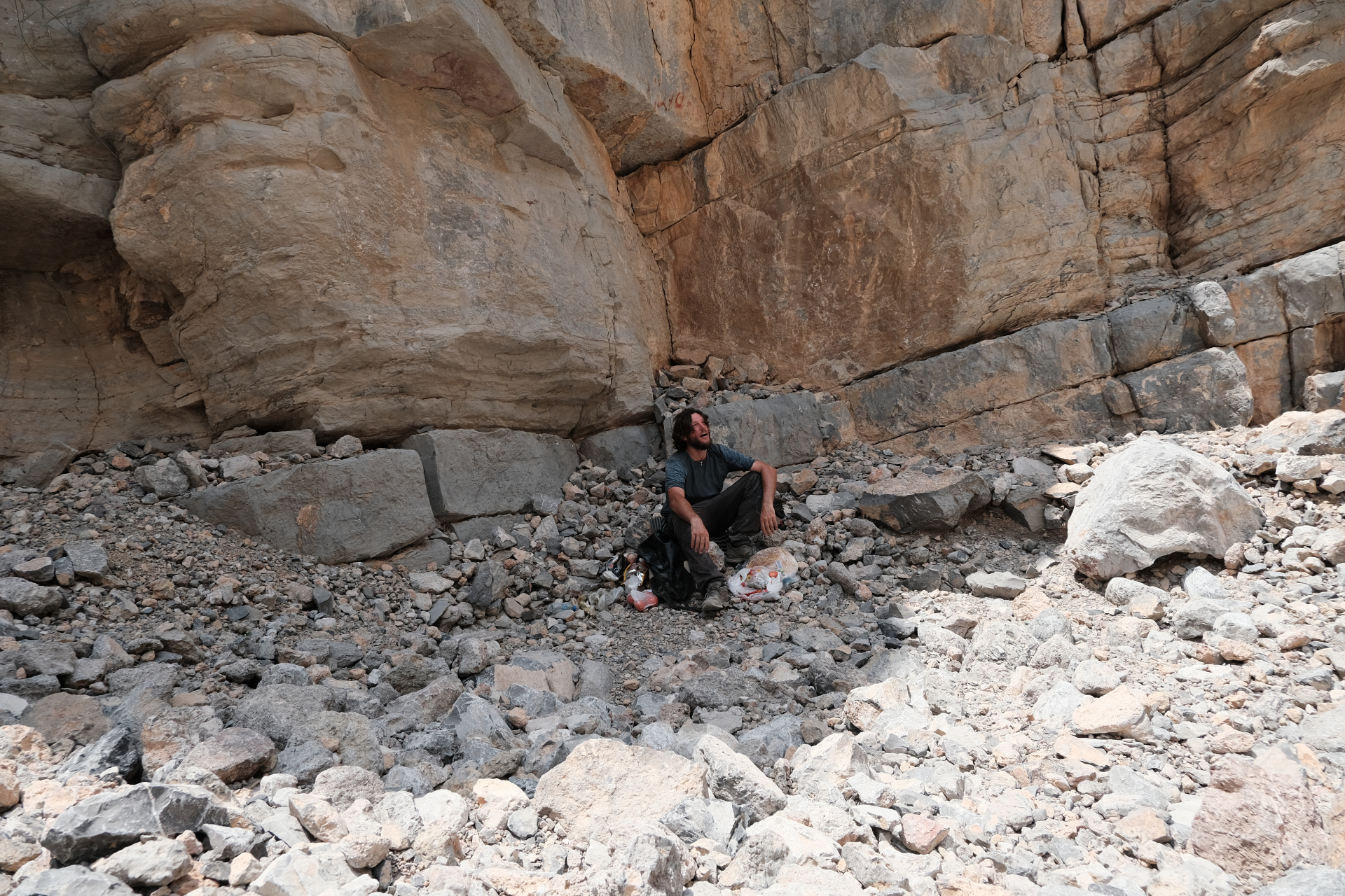 Das Bild ist geprägt von einer massiven Steinwand im Hintergrund und einem Boden voller Geröll. Ich sitze erschöpft und etwas verzweifelt in dem kleinen Schattenbereich, den die Fläche bietet.