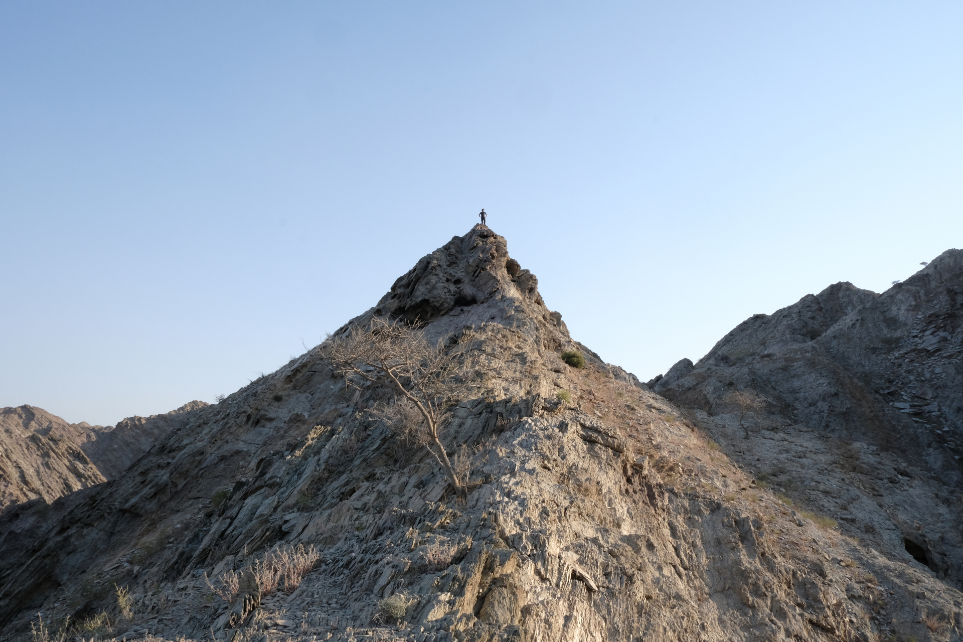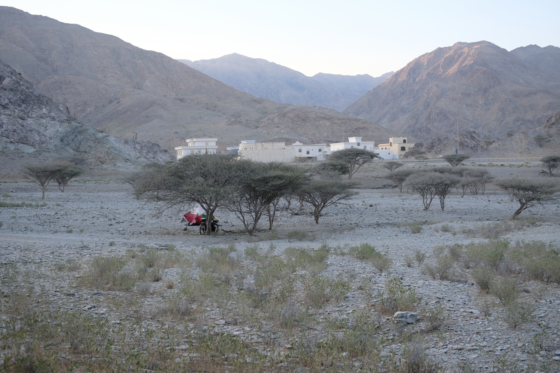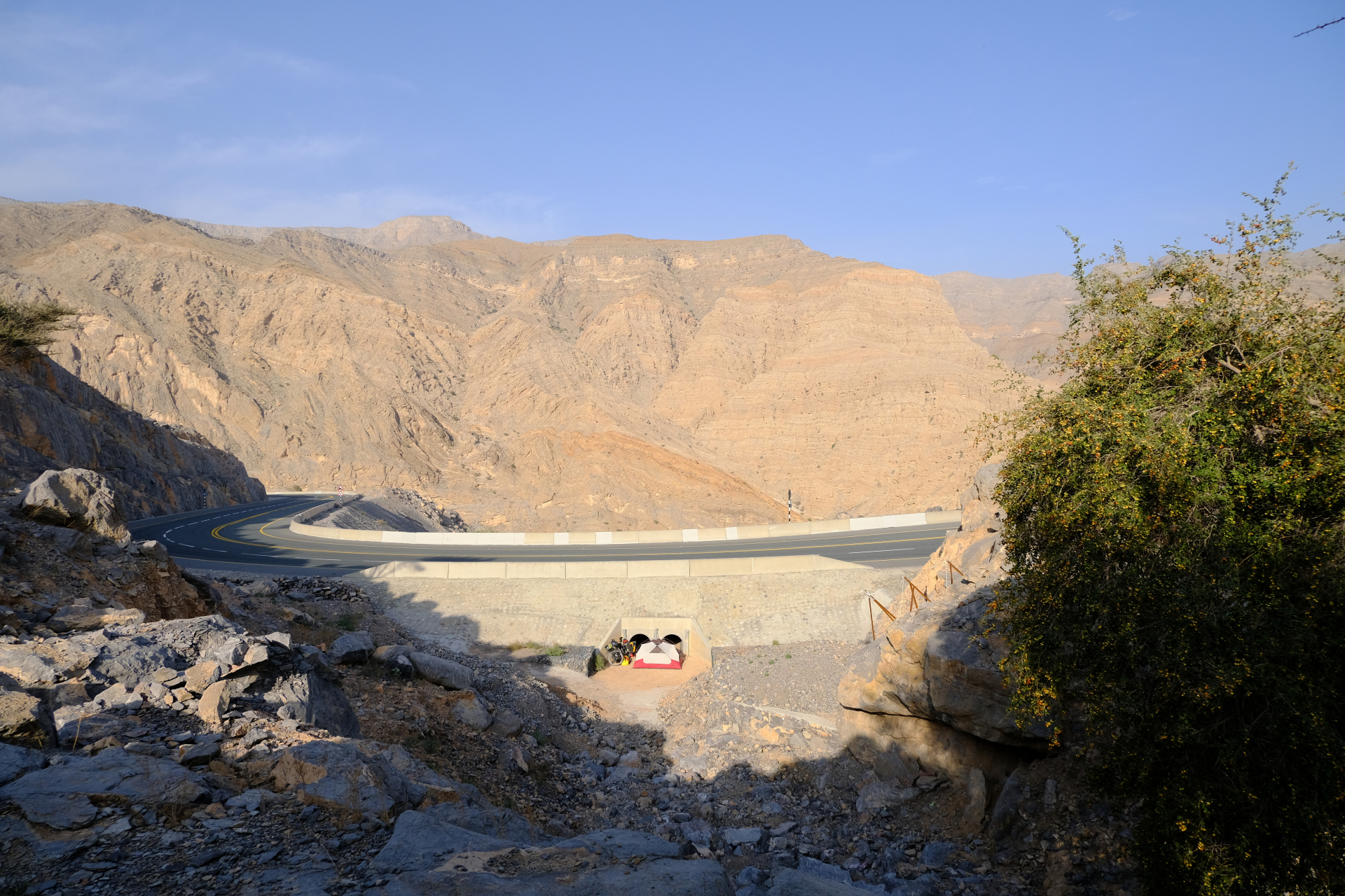 Dank des Rückenwinds schaffte ich an diesem Tag noch fast die Strecke bis nach Dibba am Golf von Oman und zeltete in Sicht des Dörfchens Wadi Fay. Nachdem ich noch Besuch von einem Local bekam und gefragt wurde, ob ich etwas benötige, machte ich mich auf den Weg in die Berge, wo es mal wieder Zeit für ein Missgeschick wurde. Nachdem ich meine Kamera aufs Stativ gesetzt hatte und ich in dem zum Gipfel hochgestürmt bin, sah ich gerade als ich oben ankam das Stativ umkippen. Fluchend ging es genauso schnell wieder runter, wie zuvor hoch und wusste schon was passiert ist. Die Kamera lag auf dem Zoomobjektiv und wie befürchtet, hatte es einen Knacks. Ich werde also schauen müssen, es reparieren zu lassen. Das ist jetzt nicht so schlimm, hab ich ja auch noch zwei Ersatzobjektive dabei. Aber als Festbrennweiten sind die nicht so bequem zu benutzen.