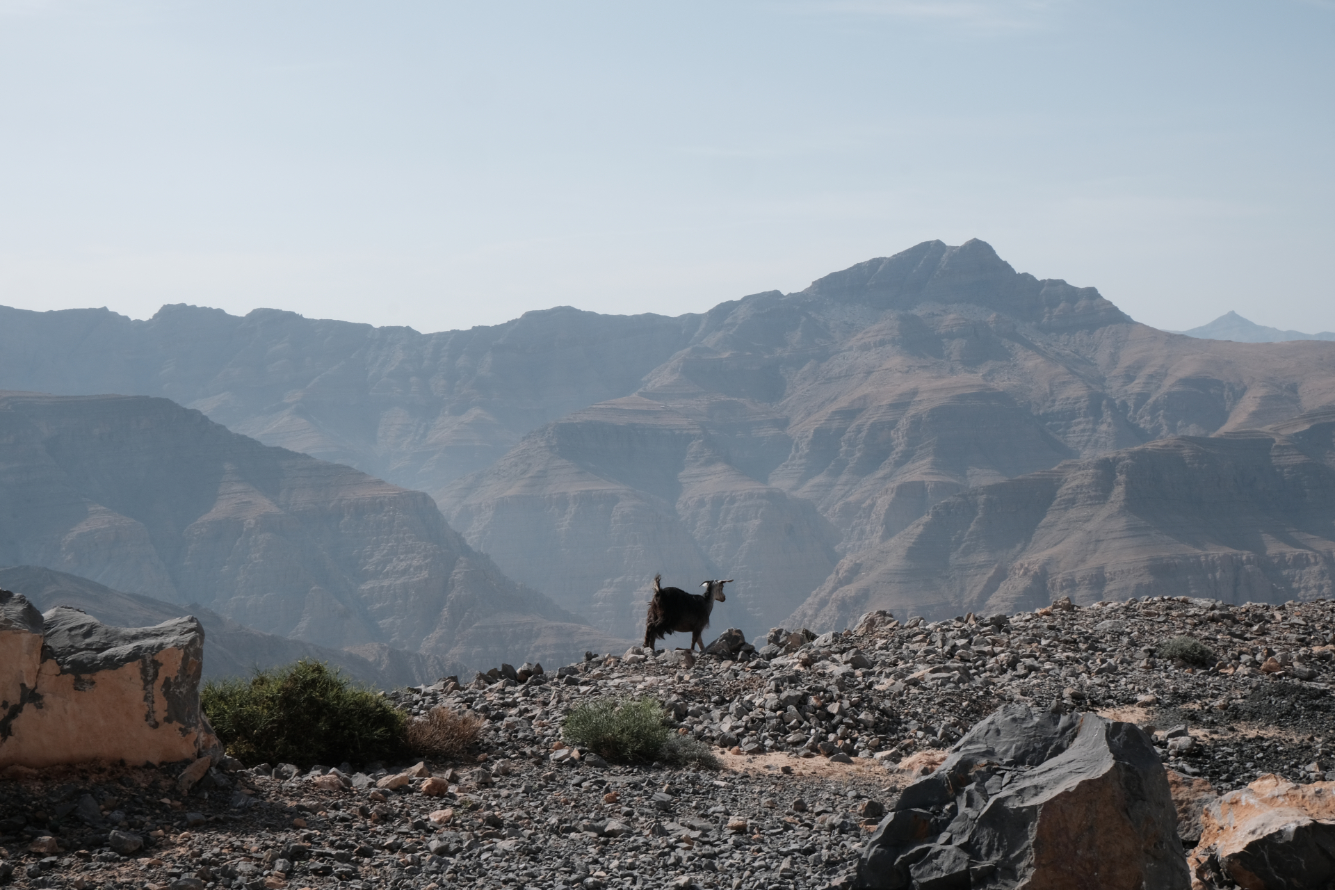 Wir stehen auf einem kleinen, steinigen Plateau. 50 Meter vor uns fällt es ab und gibt den Blick frei auf die Berge des Hadschar-Gebirges. Direkt am Rand steht eine dunkelbraune Ziege und schaut in die Ferne.