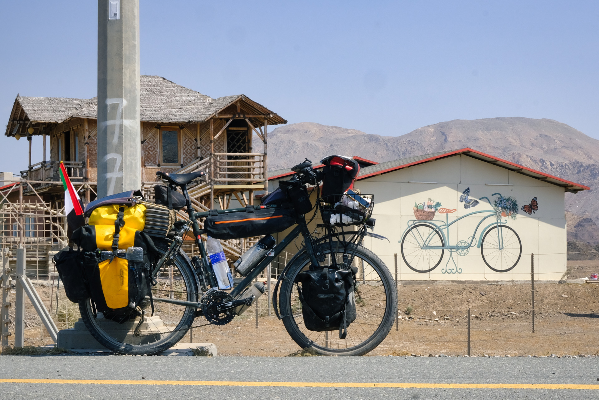 Das beladene Fahrrad lehnt an einer Mauer. Hinter der Mauer steht in weißer Schrift auf grünem Kunstrasen: Jebel Jais.