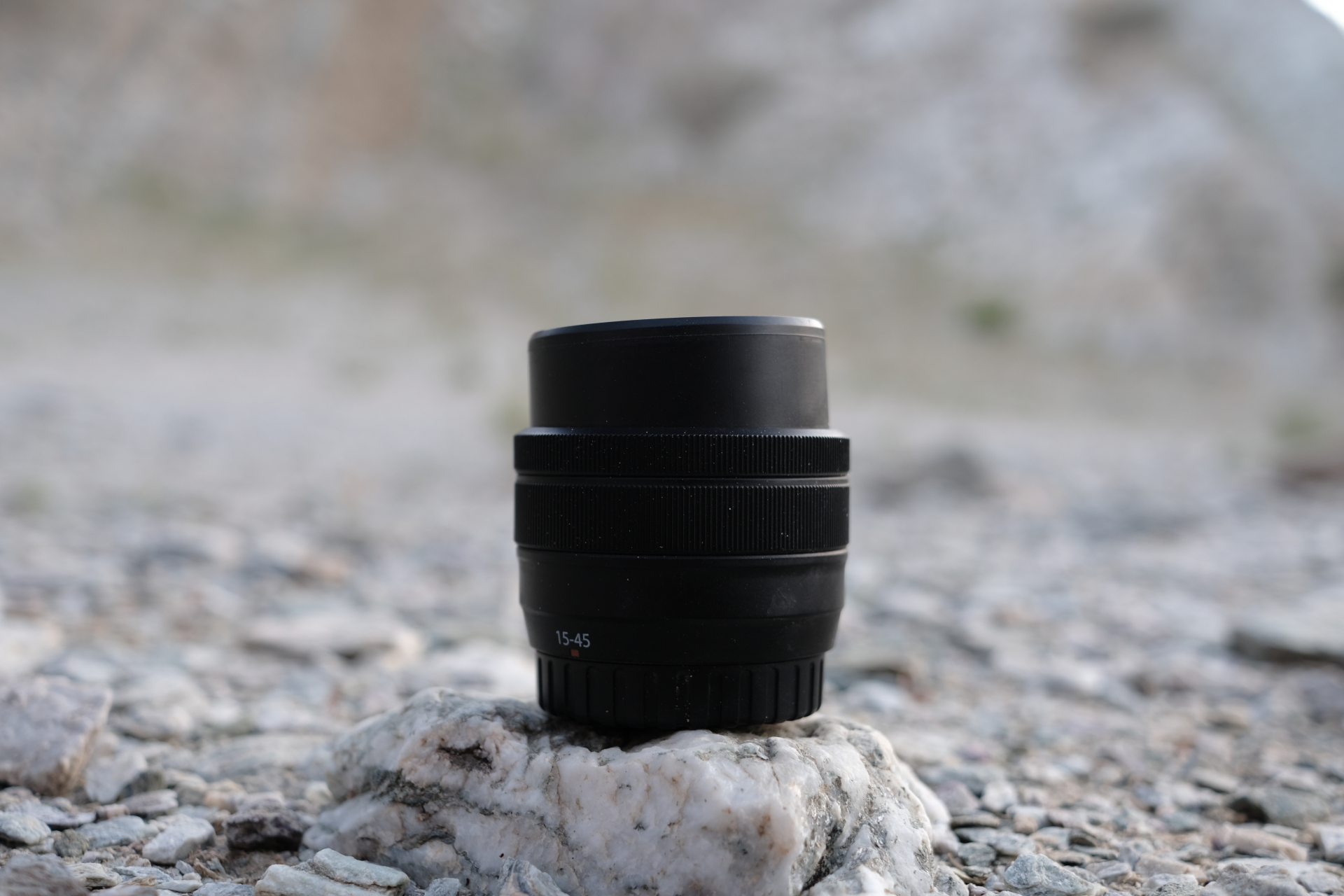 Mein Zoomobjektiv im Großformat auf einem Stein. Man erkennt eindeutig, dass die Zoomfunktion gebrochen ist.