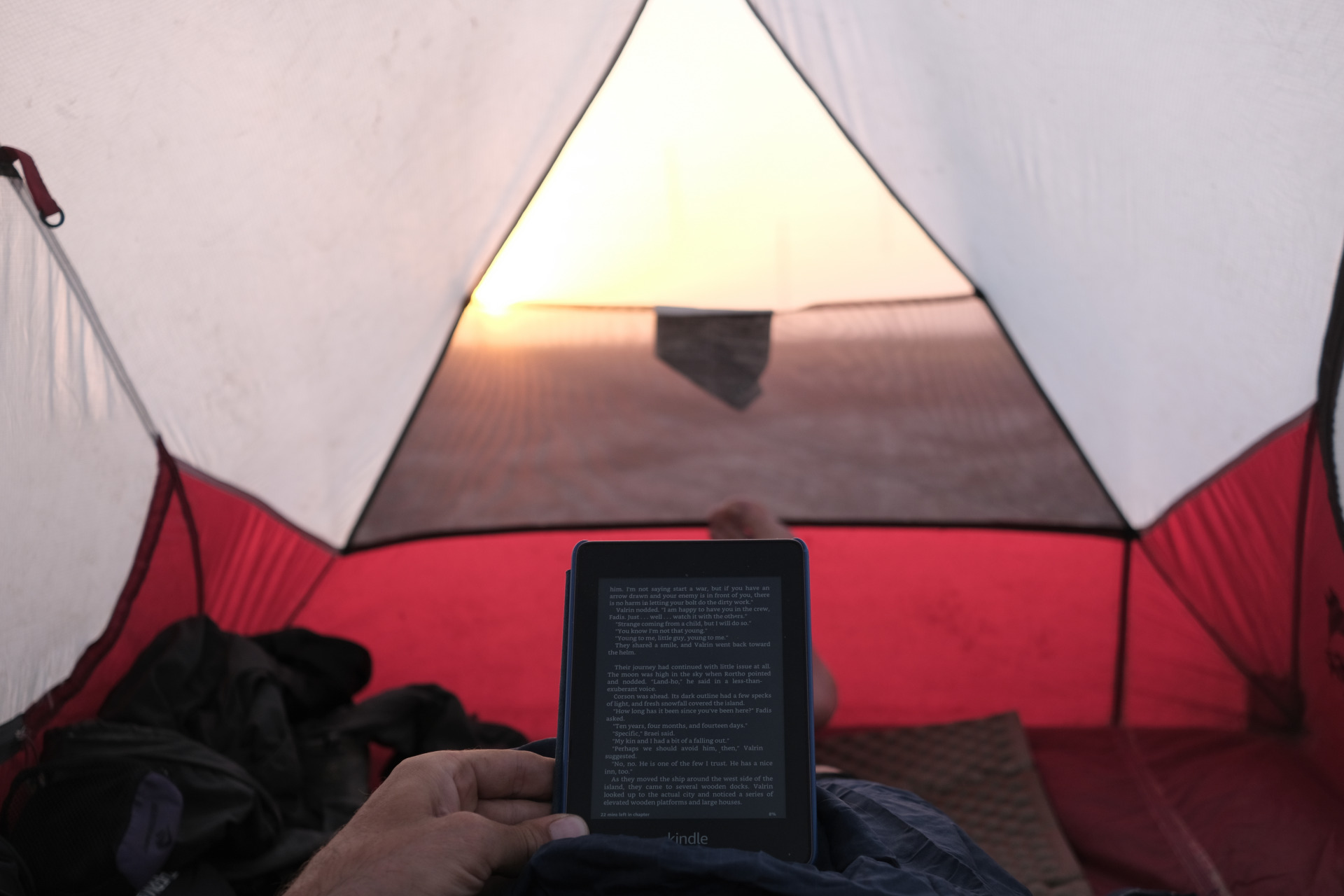 Ich liege in meinem Innenzelt. Das Bild zeigt die Sicht aus meinen Augen, wobei ich einen E-Book-Reader lässig in der Hand halte. Durch das Zelt-Mesh blicken wir auf den Horizont und die untergehende Sonne